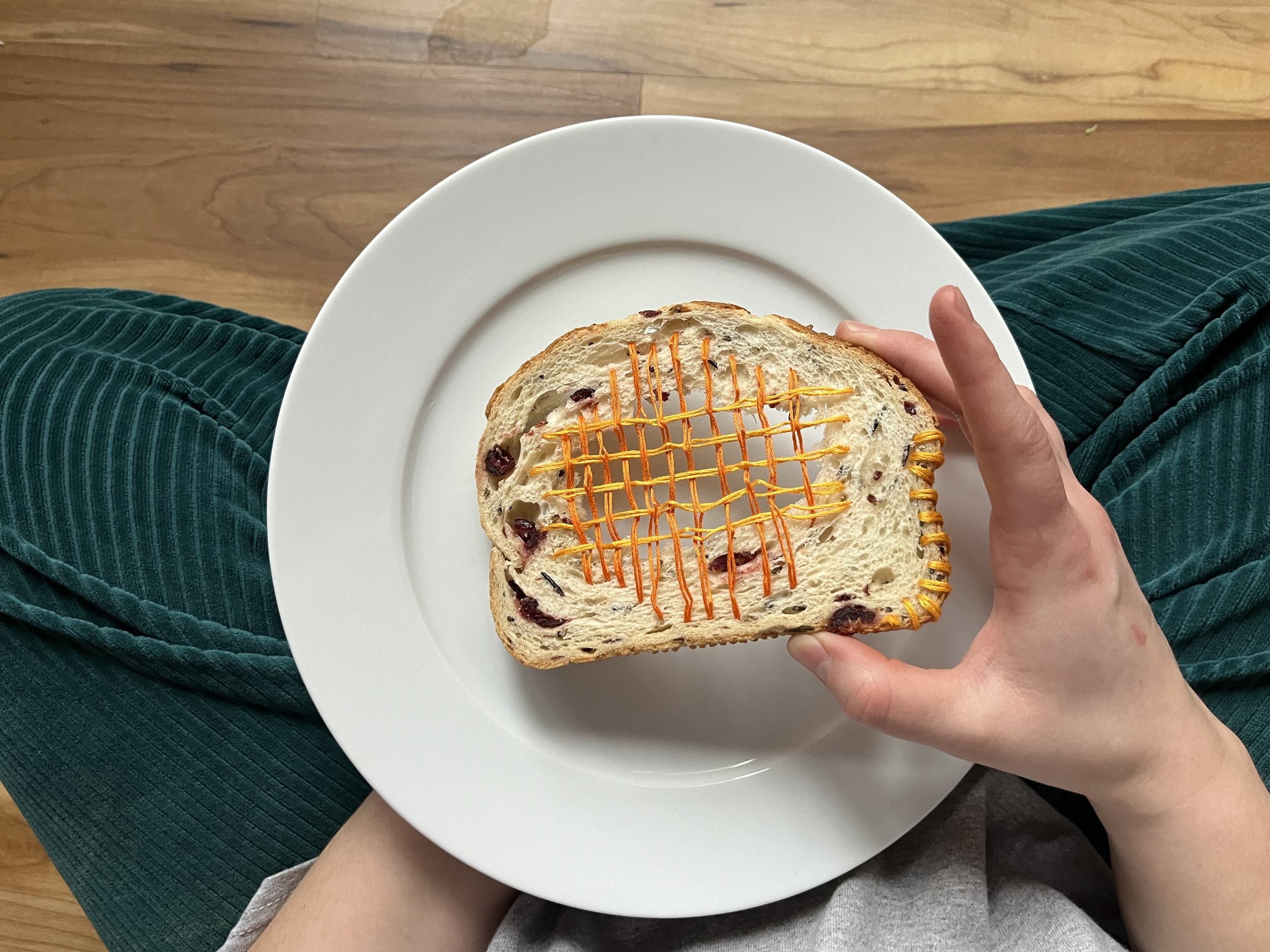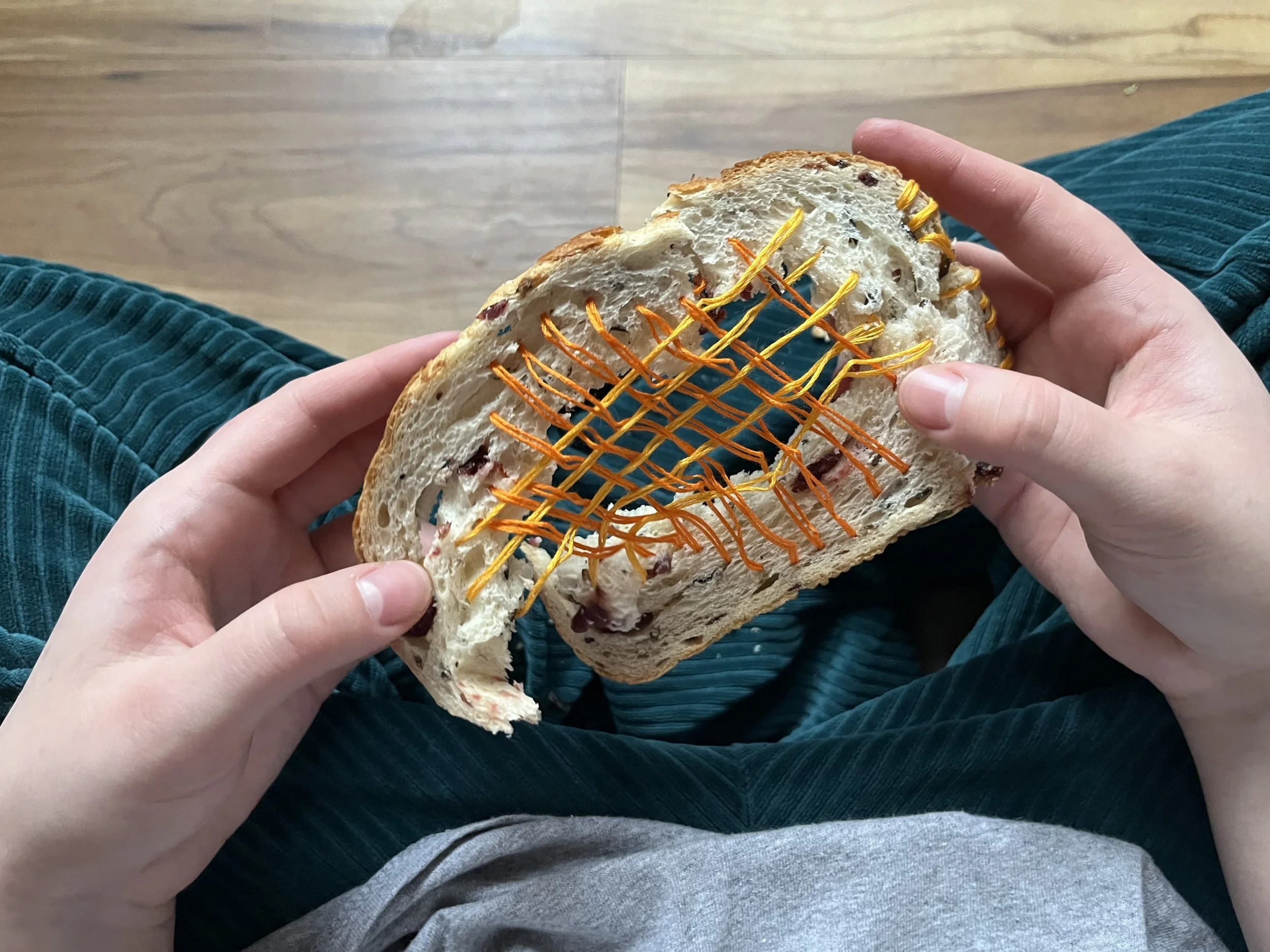 Linen thread on cranberry raisin, bread slice